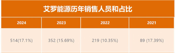 对比一下行业数据就知道派能科技的这个情况有多离谱,比如同样营收基本都来自境外且营收规模也差不多的艾罗能源,人家的销售人员数量和占比都明显超过派能科技。