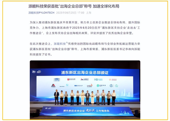 6月25日,派能科技在官微上发布公司获得了首批“出海企业总部”称号的消息。