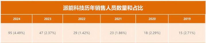 大家没有看错,2024年公司的销售人员仅有95人,占比不到5%,而且这还是在2023年的基础上翻倍增长后的结果,2023年仅有47人,在2020年之前更是仅有不到20人。