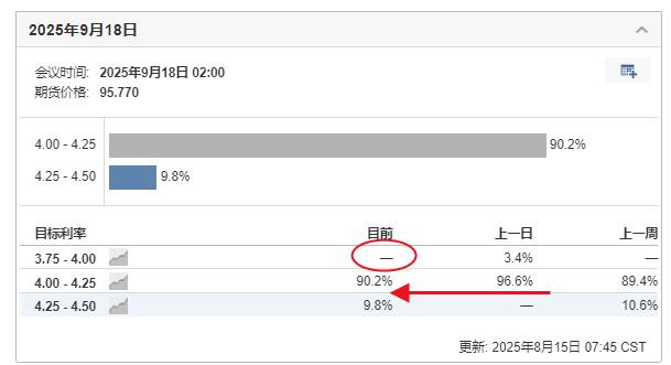 截至今天早上,9月降息25基点的概率有所回落,降息50基点的可能性已回归至零,相当于取消了暴力降息的选项。