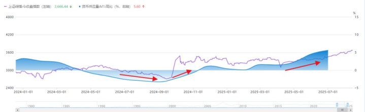 从去年5月以来,股市行情与货币M1就高度相关了。